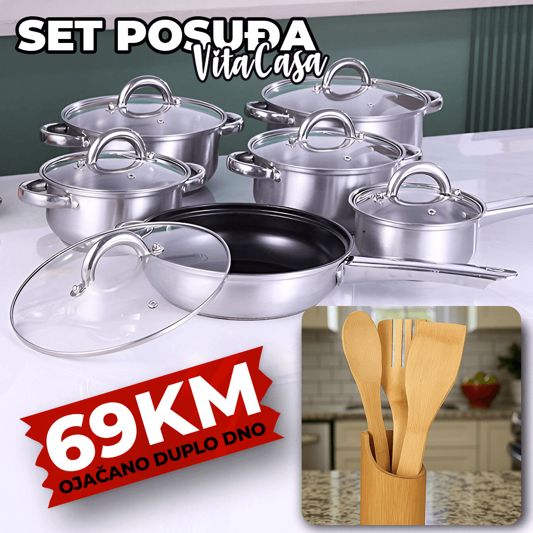 Savršen dodatak svakoj kuhinji! Set posuđa VitaCasa izrađen je od kvalitetnog materijala s ojačanim duplim dnom, koje osigurava ravnomjerno zagrijavanje i dugotrajan vijek trajanja. Idealan je za svakodnevnu upotrebu, a moderan dizajn savršeno se uklapa u svaki enterijer.
