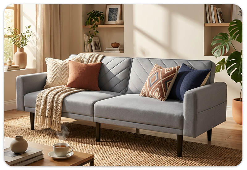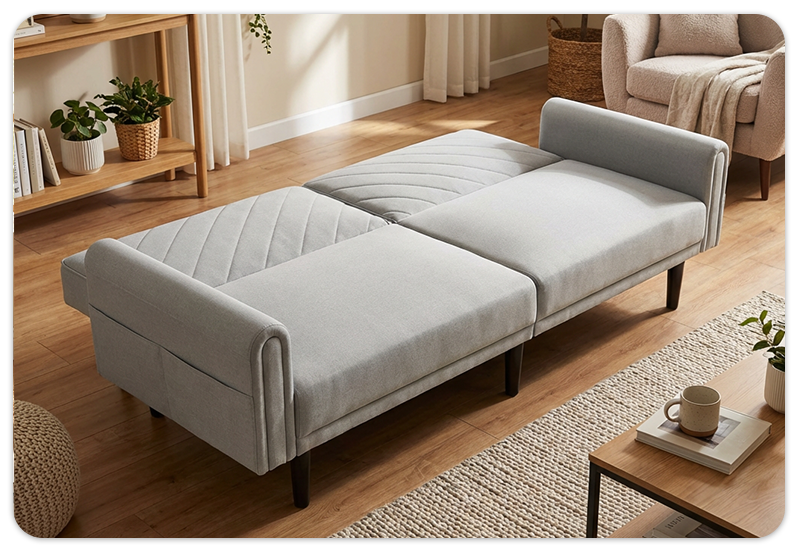 Jednim jednostavnim potezom sofa se pretvara u praktičan ležeći položaj, idealan za kratki odmor ili noćni san. Površina za ležanje dimenzije 100 cm pruža dovoljno prostora za udobno spavanje, što je čini savršenim izborom za manje stanove, vikendice ili gostinske sobe. Idealna je kao dodatni ležaj kada vam zatreba brz i praktičan način smještaja.