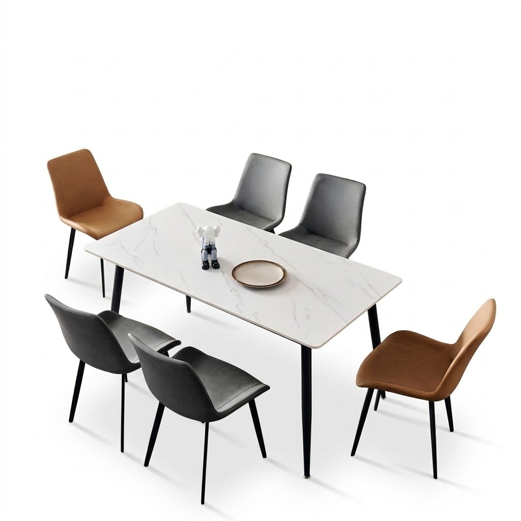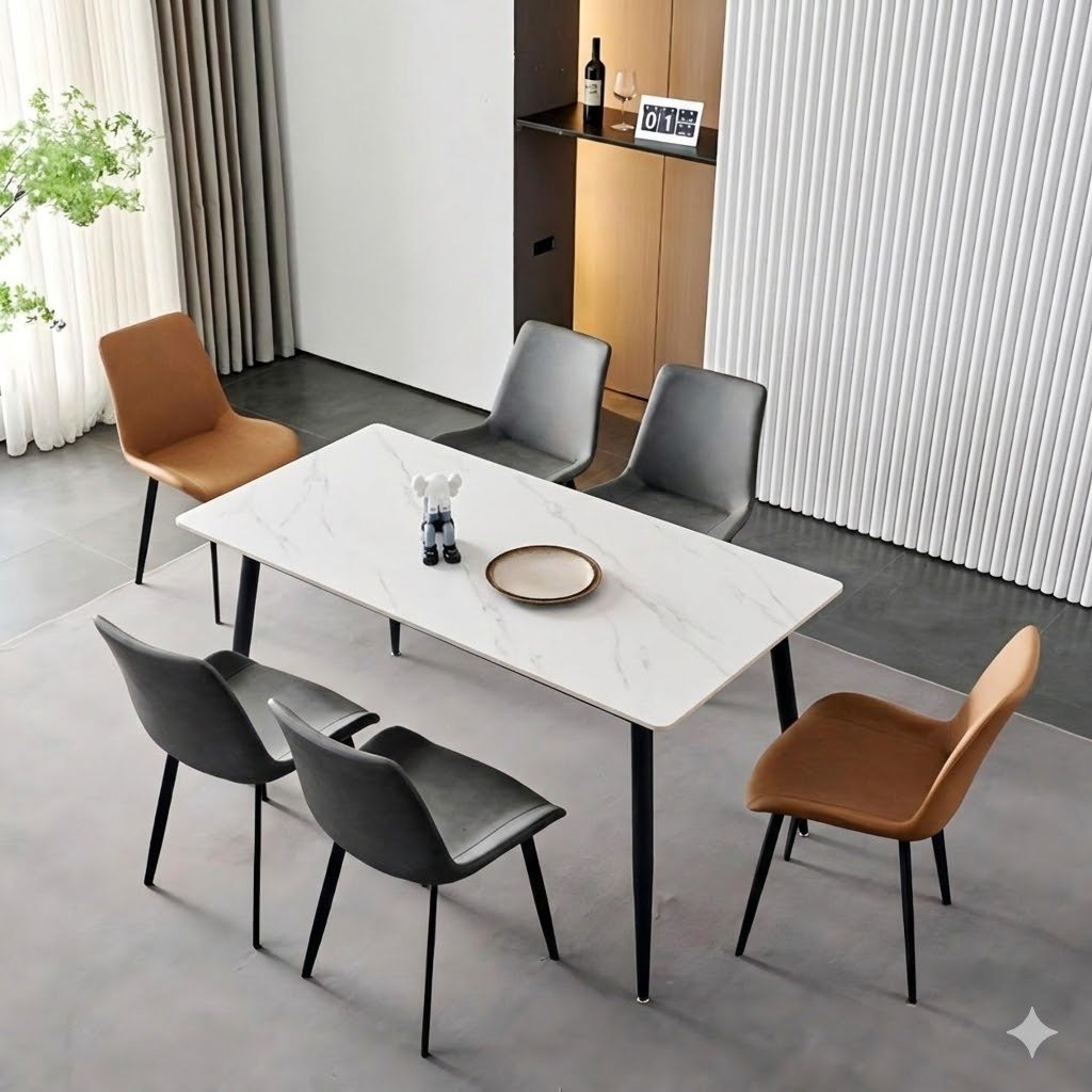 Moderan i elegantan blagovaonski set koji spaja premium materijale s minimalističkim dizajnom. Keramička ploča stola s imitacijom mramora savršeno se usklađuje s mekim stolicama od eko kože, stvarajući sofisticiran izgled za svaki dom.