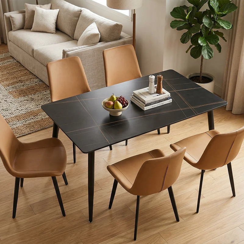 Ovaj moderni trpezarijski sto savršen je spoj stila i funkcionalnosti za svaki savremeni dom. Keramička ploča u dubokoj antracit boji s zlatno-smeđim venama pruža dojam luksuznog mramora, uz iznimnu otpornost na ogrebotine, toplinu i mrlje. Dimenzije 130×70 cm idealne su za trpezarije srednje veličine, s dovoljno prostora za šestero gostiju. Vitke crne metalne noge osiguravaju stabilnost i eleganciju, uklapajući se uz različite stilove enterijera. Uložite u komad namještaja koji će godinama krasiti vaš dom i oduševljavati goste.