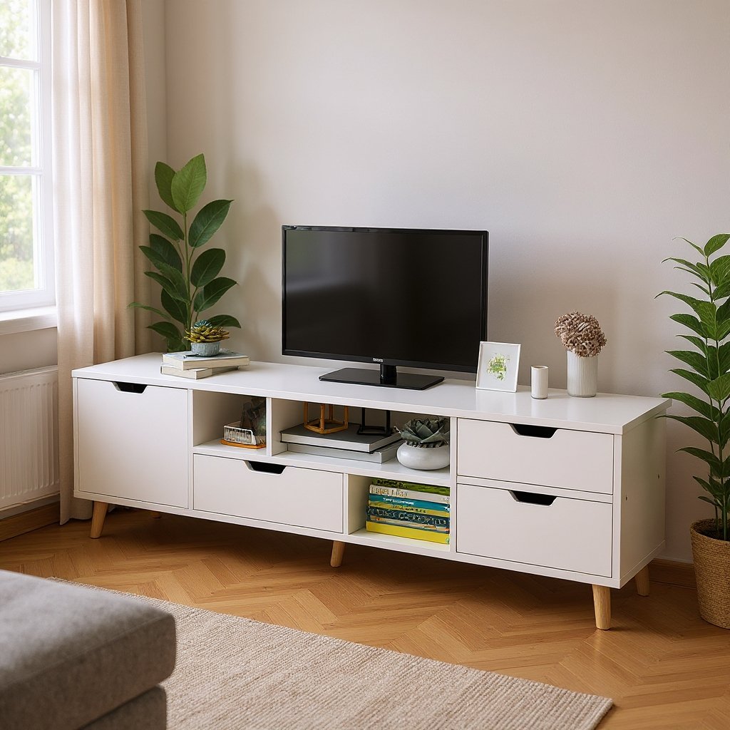 Ova moderna bijela TV komoda savršeno kombinuje jednostavne linije i funkcionalnost, čineći je idealnim dodatkom svakom dnevnom boravku. Uz više zatvorenih i otvorenih pretinaca, pruža dovoljno prostora za odlaganje knjiga, dekoracija i multimedijalne opreme. Stabilne drvene nogice daju joj prirodan i topao izgled, dok čista bijela površina unosi svježinu u prostor. Praktična, estetska i lako uklopiva u svaki stil uređenja – komoda koja podiže izgled čitave prostorije.